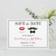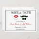 Funny vintage save the date cards with red lips and a moustache, along with a pearl necklace and bowtie.