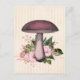Pretty vintage look postcard features pink tinted mushroom with pink florals and lush green leaves on a vintage striped background