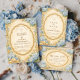 A romantic coastal wedding design inspired by classic seaside celebrations. Soft watercolor blue hydrangeas, seashells, rope details, and small nautical anchors frame an elegant scalloped label on a warm parchment background. The vintage illustration style blends botanical garden elegance with subtle nautical elements, creating a refined seaside aesthetic perfect for beach weddings, coastal venues, and ocean-inspired celebrations.