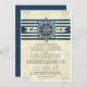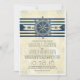 navy nautical wedding invitation with blue stripes, bride's and groom's initials and boat wheel with rope.