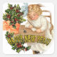 A little girl writes a letter using a dip pen. An arrangement of holly stands on the table nearby. The text says HAPPY NEW YEAR!