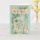 A vintage New Year's card illustration features a scroll with "New Year Wishes" across it and a page from a calendar for January 1. Blue Forget-Me-Not flowers and blue ribbons frame this wish on the front of the card, "May this New Year be the happiest and the best of all years for you." Inside the card is this message "Out with the old, in with the new, may you be happy the whole year through."