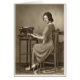 A vintage photograph of an office worker sitting at a typewriter, her back straight, feet planted on the floor, and her hands poised over the keyboard. She turns and looks over her shoulder with a slight smile and says, "I need a vacation. And by “vacation” I mean I need to move away and find a new job. On a beach. With rum."