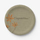 This paper plate features a burlap background with orange flowers to the left. On the right, it says, "Congratulations!"