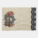 This haunting Vintage Halloween kitchen towel features a black ornate frame with a skull design on the lower edge of the towel. The background is a tan colour with a handwritten overlay and vintage lace design on the top edge.
