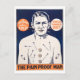 This postcard is a reproduction of a vintage poster advertising the Pain Proof Man, "world famous oddity," as part of the "Believe It or Not" troupe promoted by Ripley. It shows the man stuck with nails, safety pins, and buttons.