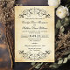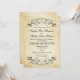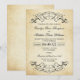 A stunning wedding invitation featuring ornate black scrollwork flourishes on an aged parchment paper background with warm, distressed edges. The calligraphic script names and refined serif typography evoke the charm of antique correspondence for a truly old-world feel. All text including names, date, ceremony and reception details is fully editable.