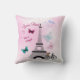 J'aime Paris au printemps ; photo branchée de la Tour Eiffel avec de jolis papillons, VTT vintage et timbre postal sur un arrière - plan brumeux rose ceinturé. Un charmant coussin qui mettra en valeur n'importe quel type de chambre, que ce soit une chambre ou un coin salon.