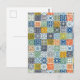 This postcard features a patchwork panel of vintage furnishing fabric that looks like a quilt.