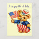 A teddy bear dressed up in a Red, White and Blue Suit while he is waving an American Flag.