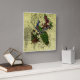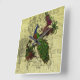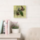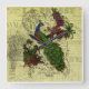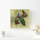 Beautiful Vintage Peacock wall clock features a brightly coloured peacock on a branch with a muted text, floral, grapes, and swirls background.