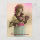Vintage colorized photograph of a less than happy young woman in dress of pale yellow, pale green, pink sash and maroon neck. She has curly brown hair and is holding a long arrangement of pink and yellow flowers. "Congratulations" below in maroon script