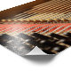 Fine art print of the exposed pinblock and strings of a vintage baby grand piano.