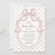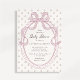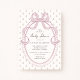 Elegant baby shower invitation featuring a decorative vintage bow frame and soft floral background. The scalloped oval border and delicate pink ribbon design create a timeless heirloom-inspired look, perfect for classic baby showers, garden themes, and traditional celebrations. A charming choice for those looking for a refined floral bow baby shower invitation with a soft vintage aesthetic.