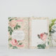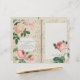Gorgeous big pink rose blooms on a delicate pink floral patterned background and a collage effect of paper for your own notes.