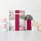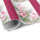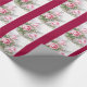This wrapping paper features a tiled design of pink vintage roses with green leaves. The dark pink stripes can be customized if desired.