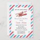 Baby shower invitation with vintage plane design and red and blue stripes background.