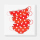 A white kitchen magnet with stacks of red and white polka dot teacups. A cute vintage design.