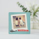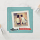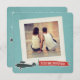 This vintage inspired wedding invitation features a halftone pattern over a retro blue background, on which is a square paper frame with space to personalize with your own photo. The bottom edge of the frame features an hand illustrated retro airplane carrying a banner that reads "you're invited." This invite is perfect for destination weddings. The white text on the back and the position of the plane and banner can be customized.