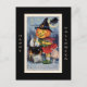 A Cute Halloween Pumpkin Witch is stirring up something in a big black cauldron while a black cat is watching overhead. Greeting: Happy Halloween. Image of a Vintage Halloween postcard on a black background.