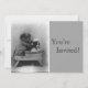 Personalized puppy photo birthday party invitations- Vintage black and white photo shows two tiny adorable puppies- one is in an old bathing washtub. The other puppy actually looks like it is washing the other pup with a washcloth! "You're Invited" is printed on the front of these cute birthday party invitations or announcements with coordinating grey background. Enter your own personal information on the other side. Change the text colour, font style, or wording if you like. The current wording is for a 4th birthday party invitation. Also unique design invitation for dog lovers, vintage photo buffs, animal charity or events, birthdays, and most any special occasion or holiday.