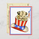 A vintage image of a puppy carrying a flag and is in a Red, White and Blue tophat.