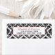 The design features a vintage black and white damask background with a decorative red border frame with an ornate floral flourish and is finished with elegant wording in black and red.
