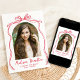 Announce your graduate’s milestone with this elegant and timeless graduation announcement, featuring a photo displayed in an arch-shaped frame, accented by a hand-drawn red bow and ribbon on a classic white background. The graduate’s name is highlighted in a stylish handwritten red script, with their school and graduation year elegantly displayed below. The back of the announcement includes a horizontal photo and space for a custom message, perfect for sharing gratitude, future plans, or party details. This sophisticated design offers a modern yet vintage-inspired way to celebrate your high school or college graduate’s achievement!