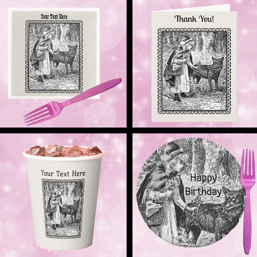 This Birthday Party invitation is a textured look white pattern with a vintage illustration in black and white in a fancy black frame of little red riding hood in the woods talking to the wolf. Customize all your information with the templates on the front and on the back. See my store for matching envelopes, mailing labels and stamps.