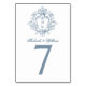 This regency-inspired wedding table number card combines timeless elegance with practical sophistication, featuring a refined floral crest at the top, personalized with the couple’s initials. Beneath the crest, the couple’s names and wedding date are displayed in graceful calligraphy, followed by a bold table number in coordinating blue tones for easy visibility. Perfect for regencycore or vintage-themed celebrations, this design adds a touch of luxury and charm to your reception tables, guiding guests to their seats while complementing your romantic and elegant décor.