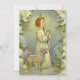 Vintage illustration religious design featuring Jesus Christ as a shepherd with a lamb. A winter snow scene during the Christmas holiday season.