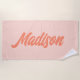 Soak up the sun and relax in style with this Vintage Retro Peach Pink Personalized Beach Towel. This simple design has blush coral peach pink background. You can change to any colour you like. Personalized in big chunky script darker peach on the centre.