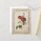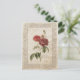 Retro postcard featuring a vintage botanical illustration of red roses with antique French style embellished frame and crumpled old paper texture.