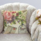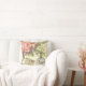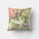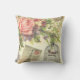 A pretty, feminine vintage design for this throw pillow, featuring pink roses, lily of the valley, a songbird in a cage, a postcard from Paris and antique writing to give your home or gift-giving a decorator, shabby chic style.
