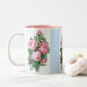Pretty vintage pink cabbage rose art blooms on this original coffee mug with elegant powder blue stripes. You pick the mug size and colours or add your own text.