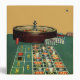 Vintage illustration business gambling design featuring an antique roulette wheel with red and black numbers. A table with chips and a spinning wheel used for gambling. Gaming at the Casino in Las Vegas!!