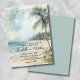 Distressed Rustic Vintage Tropical Wedding Invitation. Set the tone for your seaside celebration with a beautiful watercolor design featuring a muted coastal palette of teal blue, tan, and green. The background depicts a charming distressed beach scene with gentle ocean waves, soft sandy shores dotted with sea grass, and a vintage palm tree gracefully positioned on the right. A beach house sits in the distant corner of the scene, adding subtle charm without taking centre stage. Phantom writing and distressed paper textures enhance the design with a vintage travel stamp vibe, perfect for a tropical or coastal-themed wedding.
