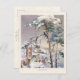 Classic nostalgic restored vintage holiday illustration featuring rustic peaceful snow-covered village with old stone church, trees and evening sky with snowflakes. Back features old parchment background with complementary scenic label with Greeting and space for personalization and editable text field.
