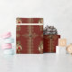 Rows of gold lace and beading with decorative brads and engraved ornaments on the corners with Victorian Santa image in a gold engraved frame. Background design is embossed red damask.