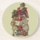 Santa Claus is having great fun in this reproduction of a vintage Christmas card. He's playing a violin as the two children in front of him are holding a candle, reading the sheet music, and singing along with a wonderful Christmas song. At their feet is a bag full of Christmas goodies. Victorian-era Santa Claus was often depicted interacting with children, where these days, Santa only comes when the children are tucked tight in their beds. The vintage Santa card is from the mid-1800s, when Santa was depicted by illustrators as a bit thinner. In this wonderful image, Santa has a red cloak, but a green hat, but not the pointy hat we've become familiar with in this era -- instead, it's surrounded by leaves.