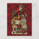 Santa Claus is having great fun in this reproduction of a vintage Christmas card. He's playing a violin as the two children in front of him are holding a candle, reading the sheet music, and singing along with a wonderful Christmas song. At their feet is a bag full of Christmas goodies. Victorian-era Santa Claus was often depicted interacting with children, where these days, Santa only comes when the children are tucked tight in their beds. The vintage Santa card is from the mid-1800s, when Santa was depicted by illustrators as a bit thinner. In this wonderful image, Santa has a red cloak, but a green hat, but not the pointy hat we've become familiar with in this era -- instead, it's surrounded by leaves.