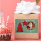 You can personalize it. Santa Claus looks like he is checking his list with the beautifully lit Christmas tree behind him.