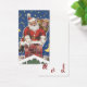 Vintage illustration Merry Christmas holiday story book cover art from the classic children's novel "Twas the Night Before Christmas." This design features a happy, jolly Santa Claus climbing down the chimney of a house with a sack full of toys on Christmas Eve. Twinkling, yellow stars are in the bright blue sky.