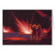 Vintage illustration futuristic Science Fiction image featuring friendly alien astronauts waving. They are on a red foreign planet or moon with exploding fire balls that look like fireworks. A classic retro 50s sci fi comic book design.