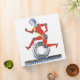 Vintage illustration science fiction business design featuring a happy, smiling, robot figure made with machine parts. The futuristic woman or man has a smile and is running with a gear, cog or wheel on a conveyor belt. A healthy sci fi guy or gal jogging for health, racing into the future!