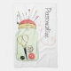 A vintage illustration of a sewing kit with a pin cushion, scissors, thread and buttons.