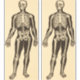 A vintage skeleton illustration in aged colours of brown, black and golden sepia tone. Whimsical and unique. Fun medical image.