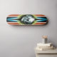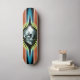A smiling skull glowing on a vintage inspired skateboard deck. A very bold red, electric blue and acid green striped design. This board will be custom made - for only the very bold and unique individual. Available in your choice of deck type with available extras. You know who you are. Govern yourself accordingly ... Carpe Diem boys and girls ...