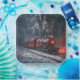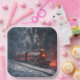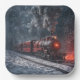 Old-fashioned steam locomotive in a snowstorm with glowing red lights.