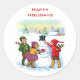 These stickers feature a vintage image of children building a snowman and the words: Happy Holidays. Enter a new message in the template to change the text. Available in two different sizes.